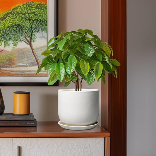 Ceramic Plant Pot - Modern 8 Inch Round Planter for Indoor Outdoor Plants with Drainage Hole and Saucer, Home House Room Office Decor, White