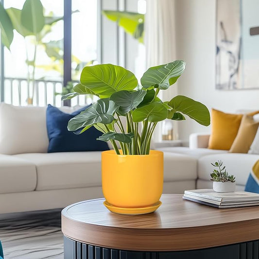 Indoor Plant Pot - 7 Inch Modern Round Ceramic Planter for Indoor Outdoor Plants with Drainage Hole and Saucer, Home Garden Office House Decor, Yellow
