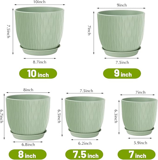 Plastic Plant Pots 10/9/8/7.5/7 inch Set of 5, Flower Planters with Drainage Holes and Saucers, Plastic Pots for Indoor Outdoor Plants, Livingroom Garden Decor (Green)