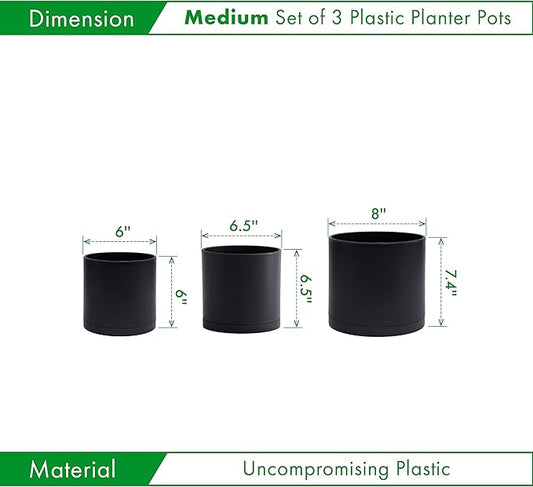 D'vine Dev 6 Inch 6.5 Inch 8 Inch, Set of 3 Plastic Planter Pots for Plants with Drainage Hole and Seamless Saucers, Black Color, Medium, 74-V-B-3