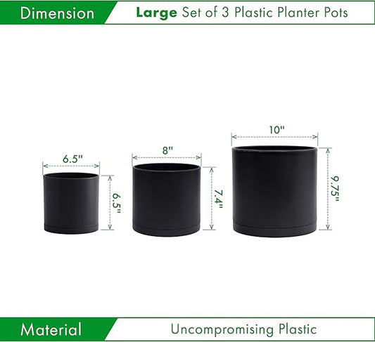D'vine Dev 6.5 Inch 8 Inch 10 Inch, Set of 3 Plastic Planter Pots for Plants with Drainage Hole and Seamless Saucers, Black Color, Large, 74-V-B-4