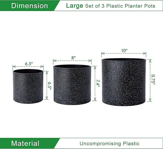 D'vine Dev 6.5 Inch 8 Inch 10 Inch, Set of 3 Plastic Planter Pots for Plants with Drainage Hole and Seamless Saucers, Speckled Black Color, Large, 74-V-F-4