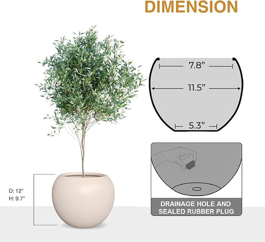 9.7" H x 12" D Globo Fiberstone Round Planter with Drainage Hole, Weather Resistant, Smooth Finish, Planters for Indoor Plants & Outdoor, 2 Extra Coco Mats (White, 7.8" Pot Opening)