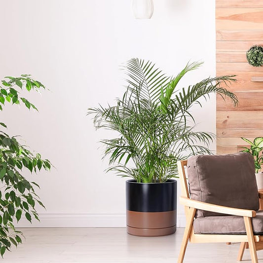 D'vine Dev 12 Inch Ceramic Planter Pot with Drainage Hole and Saucer, Indoor Cylinder Round Planter Pot, Black/Speckled Tan, 94-O-F-7