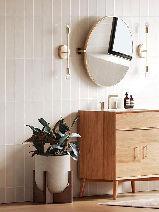 LE TAUCI 12 Inch Pots for Plants with Acacia Wood Stand, Ceramic Large Planters for Indoor Plants, Indoor Plant Pots for Office Living Room, Cylinder Pots for Plants with Drainage Hole and Plug, White