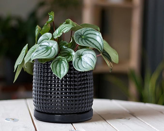 D'vine Dev 6 Inch Ceramic Beaded Stoneware Planter Pot - Flower Pot with Drainage Holes and Saucers for Indoor Succulent Plants or Flowers, Glossy Black, 27-C-X-2