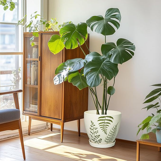 Ceramic Plant Pot 10 Inch - Ceramic Planter for Indoor Outdoor Plants, Decorative Boho Round Planter with Drainage Hole and Saucer, Housewarming Gifts, Office Garden Home Decor, White