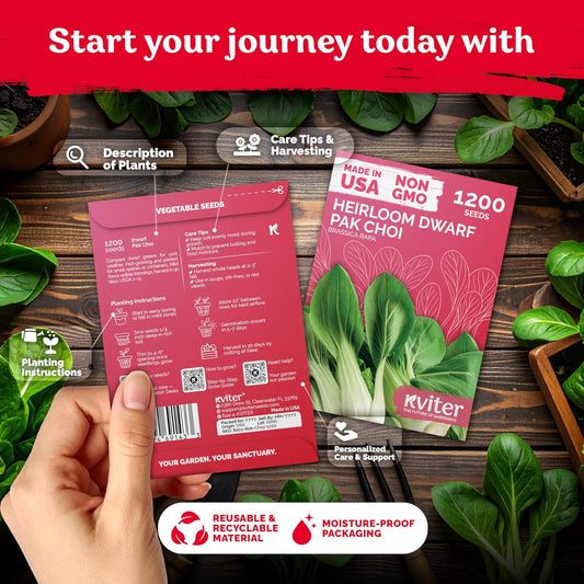 KVITER 1,200 Baby Bok Choy Seeds for Planting (Brassica rapa subsp. chinensis) – Heirloom Extra Dwarf Pak Choi, White Stem Chinese Variety – Organic Cabbage Seeds to Plant in Vegetable Garden