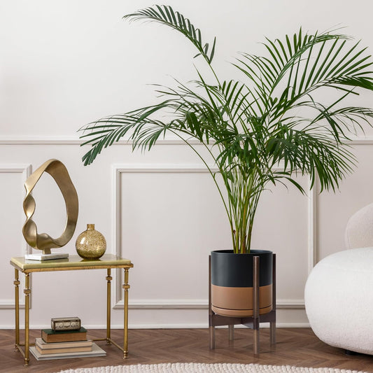 D'vine Dev Ceramic Planter with Walnut Color Stand - 10 Inch Modern Round Flower Pot with Wood Planter Holder, Black/Speckled Tan, 55-B-X-7