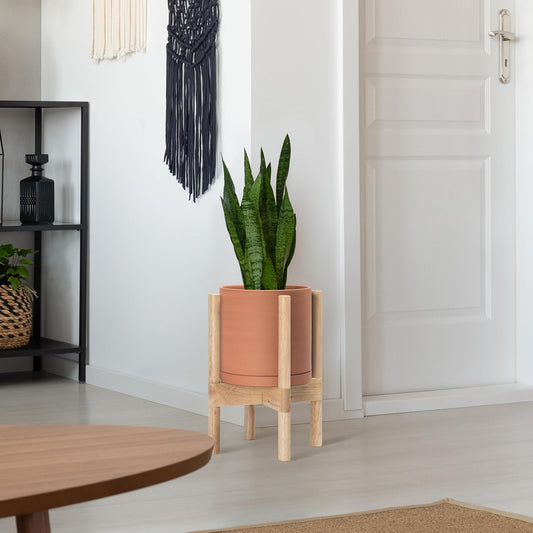 D'vine Dev Terracotta Planter with Natural Stand - 8 Inch Modern Round Flower Pot with Wood Planter Holder, Terracotta, 55-B-N-5
