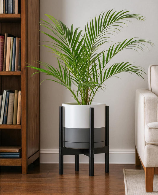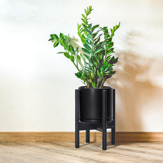 D'vine Dev Ceramic Planter with Ebony Stand - 8 Inch Modern Round Flower Pot with Wood Planter Holder, Black, 55-B-M-2