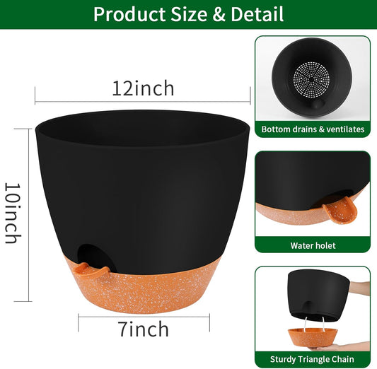 GARDIFE 12 inch planters, Plant Pots,Self Watering Pots, Large Plastic Flower pots with Deep Reservior and High Drainage Holes for Indoor Outdoor Plants and Flowers, Black