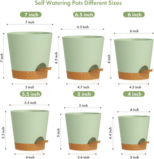 7/6.5/6/5.5/5/4 inch Self Watering Pots for Indoor Outdoor Plants, 6 Pack Plastic Flower Planters with Drainage Holes and Removable Saucers, Plant Pots with Wicking Rope, Green Brown