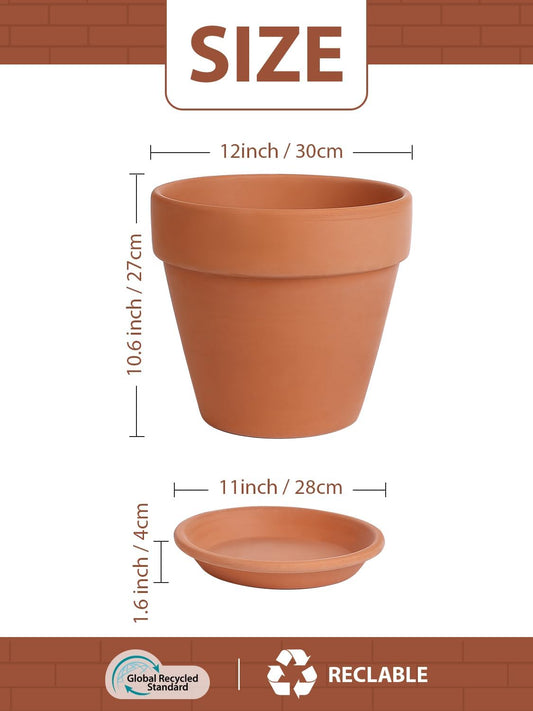 INGOFIN 12 Inch Terracotta Pot with Saucer - Ceramic Clay Pot for Plants with Drainage Hole, Large Terra Cotta Flower Planter with Tray for Indoor Outdoor Plants