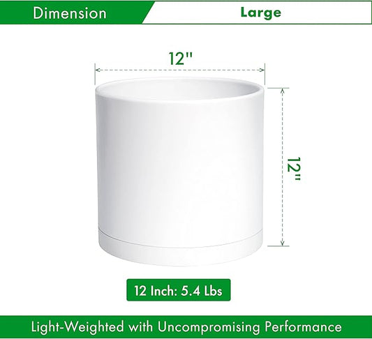 Cylinder 10 inch Plant Pots, Mordern Plastic Planters with Drainage Holes and Saucers for Indoor Outdoor Plants Flowers, White