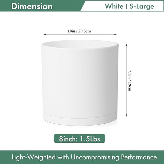 Cylinder 8 inch Plant Pots, Mordern Plastic Planters with Drainage Holes and Saucers for Indoor Outdoor Plants Flowers, White