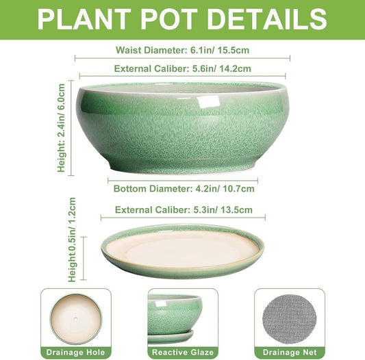 SQOWL Succulent Pots 6 Inch - Ceramic Bonsai Planter for Indoor Plants Outdoor, Shallow Planter with Drainage Hole and Tray, Round Planters for Cactus Flower, Office Decor, Gardening Gifts, Green