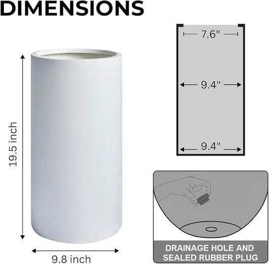 19.5"H x 9.8"D Tubo Fiberstone Cylinder Tall Planter with Drainage Hole, Smooth Finishes, Weather Resistant for Indoor and Outdoor Use, Included 2 Extra Coco Mats (White, 8.2" Pot Opening)