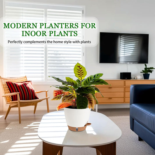 2 Pack 8 Inch Pots for Plants Indoor, Plastic Self Watering Planters with Drainage Holes, Water Level Indicator & Deep Reservoir, Decorative Flower Pots Indoor Outdoor Use (White