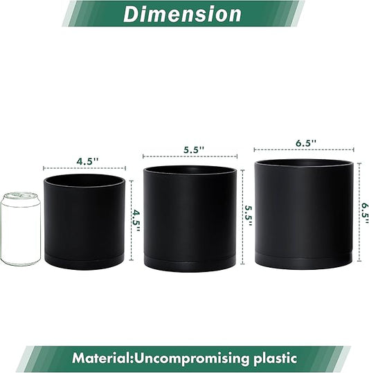 D'vine Dev 4.5 Inch 5.5 Inch 6.5 Inch, Set of 3 Plastic Planter Pots for Plants with Drainage Hole and Seamless Saucers, Black Color, Small Plus, 74-V-B-2