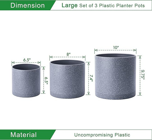 D'vine Dev 6.5 Inch 8 Inch 10 Inch, Set of 3 Plastic Planter Pots for Plants with Drainage Hole and Seamless Saucer, Speckled Gray Color, Large, 74-V-G-4