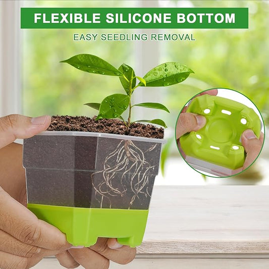 Aobiono 10 Packs 4 Inch Clear Nursery Pots with Reinforced Silicone Base for Easy Transplant, Reusable Seed Starter Seedling Small Plant Flower Pots with Drainage (Green, 10 Packs)