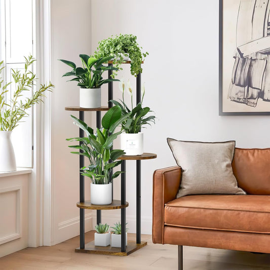 5 Tier Plant Stand Indoor, Metal Wooden Tall Plant Shelf Flower Pot Stand for Multiple Plants, Corner Flower Holder Plant Display Rack for Living Room Balcony Patio Garden (Rustic Brown)
