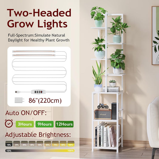 Plant Stand Indoor with Grow Light, 7-Tiered Tall Plant Stand Indoor, Metal Plant Shelf with Bookshelf Bookcase and Adjustable Light, Ideal for Living Room, Reading room, Garden, Patio (white)