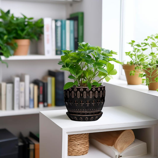 G EPGardening Ceramic Pot for Plants 5.5 Inch - Ceramic Plant Pot Indoor with Drainage Hole and Saucer, Round Boho Planter for Indoor Plants Outdoor, Housewarming Gifts, Garden Office Decor, Black
