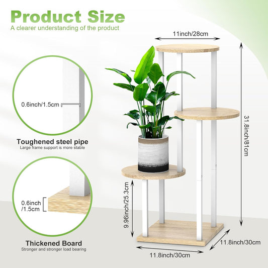 4 Tier Wood Tall Plant Stand Metal Rack Indoor, Multiple Flower Pot Holder Shelves Corner Rack, Round Planter Shelf Display Rack Storage Organizer for Patio Living Room Balcony(White Oak)