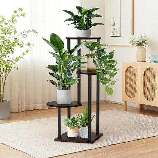 4 Tier Plant Stand Indoor, Metal Wooden Tall Plant Shelf Flower Pot Stand for Multiple Plants, Corner Flower Holder Plant Display Rack for Living Room Balcony Patio Garden (Black)