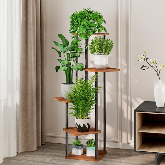 AZERPIAN Plant Stand 5 Tier Indoor Metal Flower Shelf for Multiple Plants Corner Tall Flower Holders for Patio Garden Living Room Balcony Bedroom, Walnut (5 Tier-Walnut)