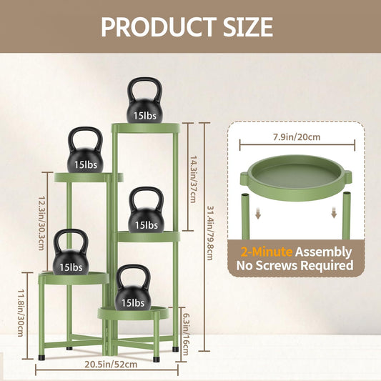 LASZOLA 5 Tiered Folding Plant Stand Indoor for Multiple Large Planter, Tall Heavy Duty Adjustable Rack with Rust Proof Plastic Shelving, Sturdy Vertical Tree Organizer for Narrow Inside Floor, Green