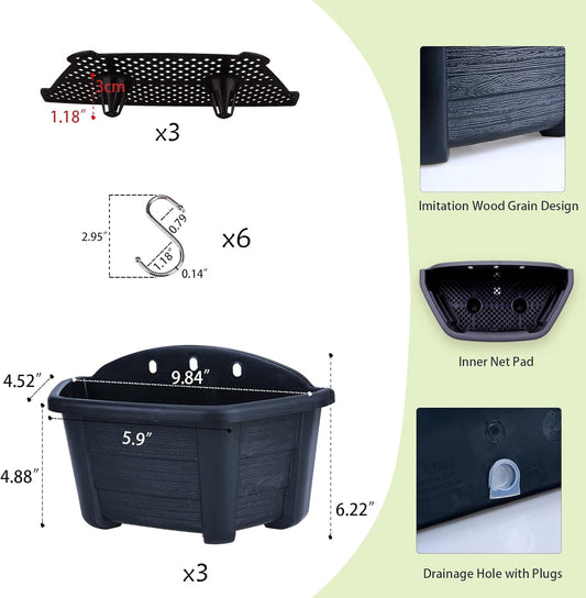 summer flower Hanging Flower Pots, 3 Pack 9.84” Wall Hanging Planters for Railing Fence Balcony, Plastic Plants Pots for Window Box Garden Outdoor Flowers Indoor Decor (Black)