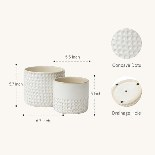 La Jolie Muse Ceramic Planter Flower Plant Pots- 6.7+5.5 Inch Concave Dot Patterned Cylinder Flower Pot W/ Drain Hole for Indoor, Set of 2, Ivory