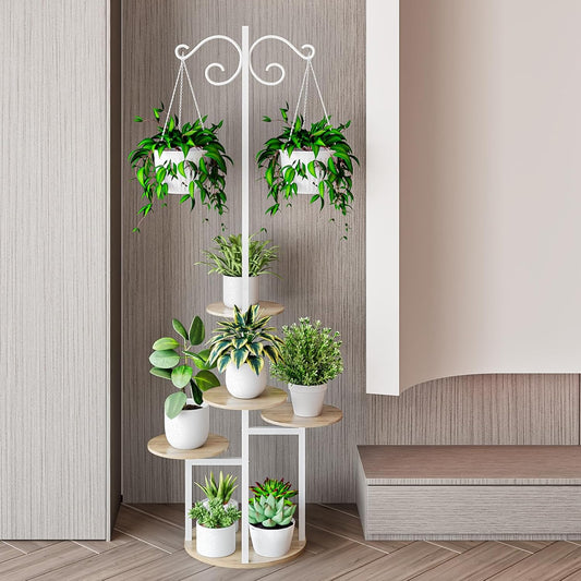 Plant Stand Indoor 5 Tier 8 Potted with hook hanging basket Multiple Flower Pot Holder for Patio Garden Balcony Living Room Corner (5 Tier with hook White+Sonoma Oak)