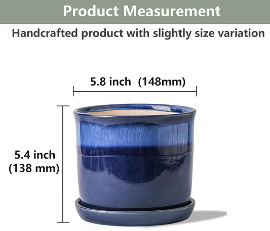 5.8 Inch Plant Pot: Ceramic Planter with Drainage Hole & Saucer for Indoor Outdoor Plants - Flowerpot with Bonded Tray for Home Office - Blue Reactive Glaze