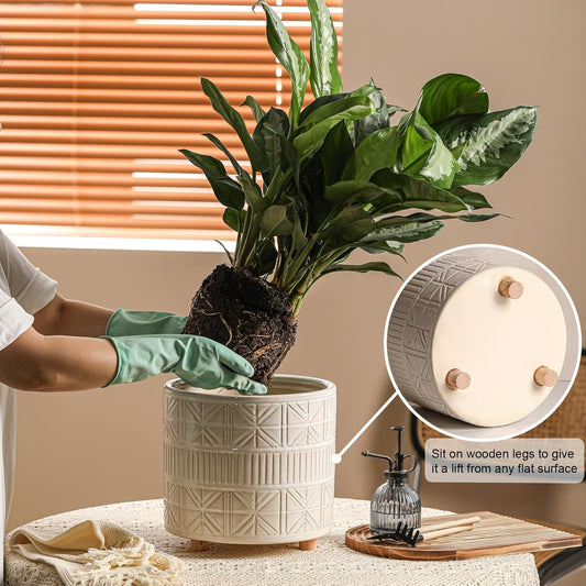 Ceramic Plant Pot with Foots: 10 Inch Planter with Wooden Legs - Large Pots for Indoor Plants - Modern Flower Pot for Home Office Patio Garden Windowsill