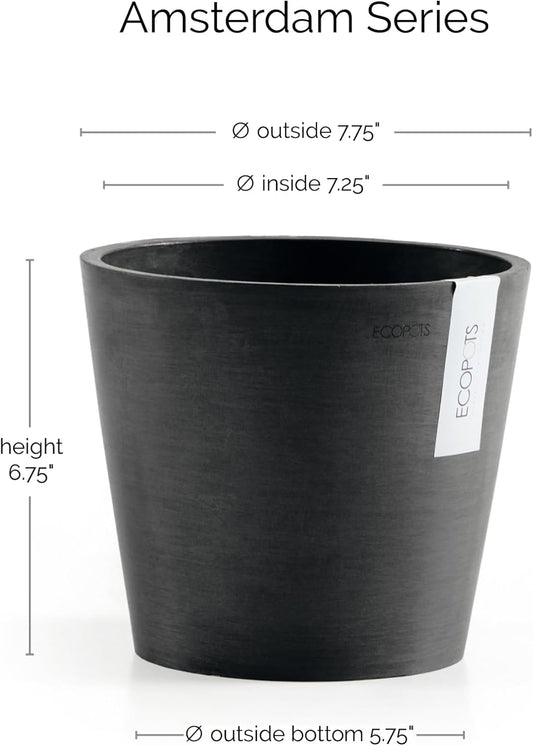 Ecopots Amsterdam Durable Modern Round Indoor/Outdoor Recycled-Based Composite Flower Pot Planter, Dark Grey, 8"