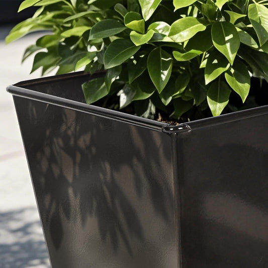 Worth Garden 28" H. Large Metal Glazed Planter Set of 2, Modern Glossy Finish Black Tall Square Tapered Steel Flower Plant Pots for Indoor & Outdoor Use - Insert Plate with Drain Holes, Air Vents