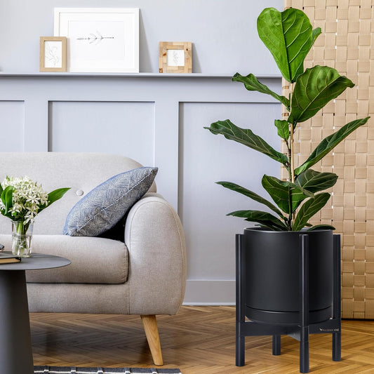D'vine Dev Ceramic Planter with Walnut Color Stand - 10 Inch Modern Round Flower Pot with Wood Planter Holder, Black, 55-B-X-2