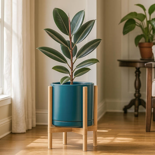 D'vine Dev Ceramic Planter with Natural Stand - 8 Inch Modern Round Flower Pot with Wood Planter Holder, Teal, 55-B-N-4