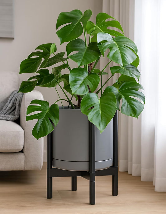 D'vine Dev Ceramic Planter with Ebony Stand - 12 Inch Modern Round Flower Pot with Wood Planter Holder, Grey, 55-B-H-3