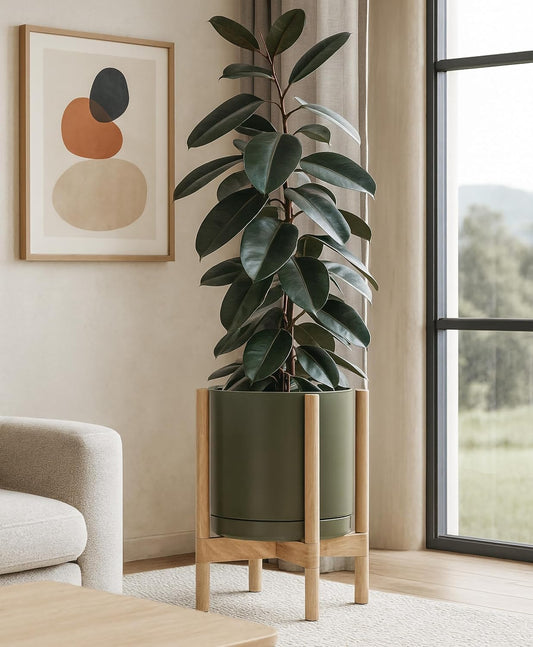 D'vine Dev Ceramic Planter with Natural Stand - 12 Inch Modern Round Flower Pot with Wood Planter Holder, Olive, 55-B-J-J