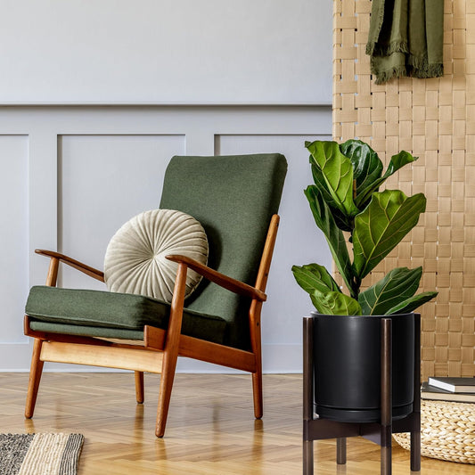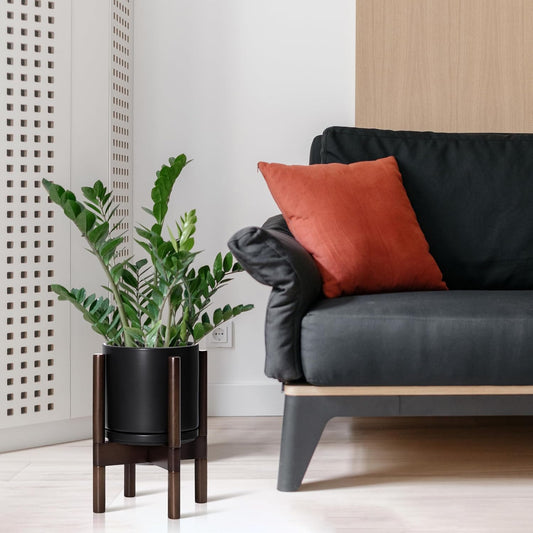 D'vine Dev Ceramic Planter with Walnut Color Stand - 8 Inch Modern Round Flower Pot with Wood Planter Holder, Black, 55-B-Y-2