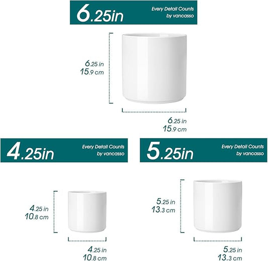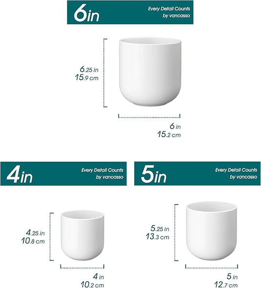 vancasso Ceramic Plant Pots, 4.25+5.25+6.25 Inch Planter Pot with Drainage Hole, Flower Pots for Indoor Outdoor Plants, Set of 3, White