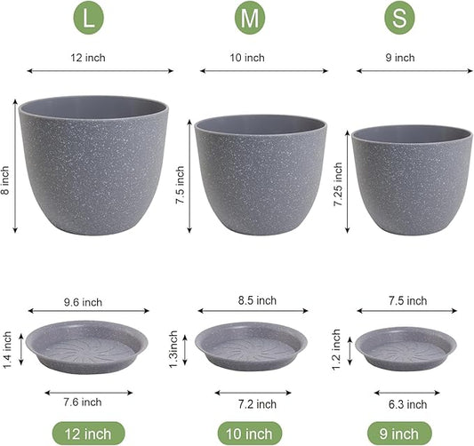 12/10/9 Large Modern Plant Pots, Plastic Planters with Drainage Holes and Saucers for Indoor Outdoor Plants Flowers, Grey Speckles