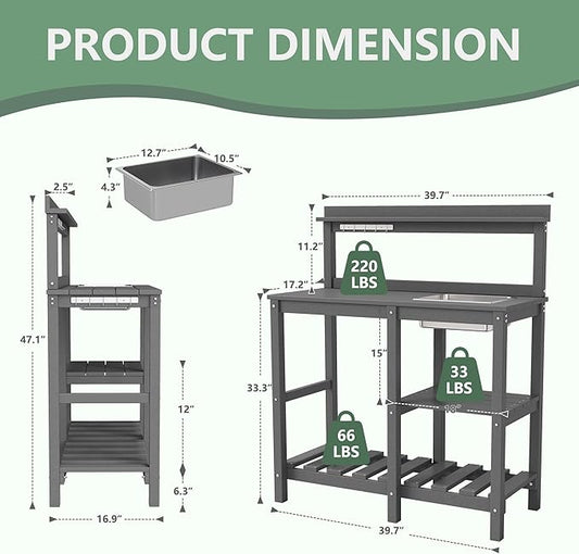 FOOWIN Potting Bench, HDPE Outdoor Potting Table with Sink, All-Weather Potting Benches for Outside, Gardening Table with Storage Shelf, Hook, for Garden, Patio, Lawns, Grey