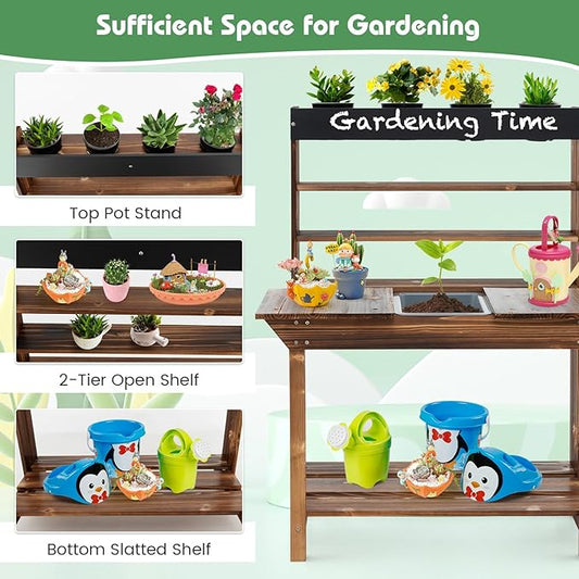 HONEY JOY Mud Kitchen, Fir Wood Kids Potting Bench Table, Removable Sink, 4 Planting Cups, Chalkboard, Outdoor Play Kitchen for Toddlers, Garden Time Mud Kitchen for Kids Outdoor Backyard