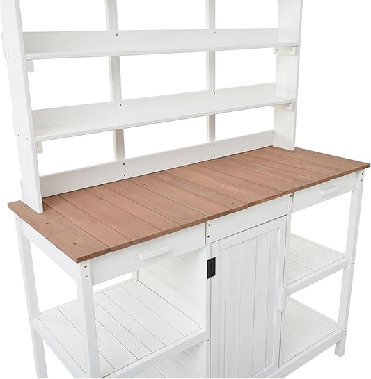 Outdoor Wooden Potting Bench Table – Farmhouse Garden Workstation with Drawers, Cabinet & Storage Shelves, Large Fir Wood Work Table for Patio, Backyard, Mudroom, Greenhouse (White & Brown, 66'' H)